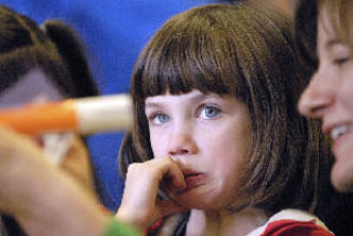 Kindergartner Emily Jones, right, is not too sure about her rocket even with the help of her mother Wendy.