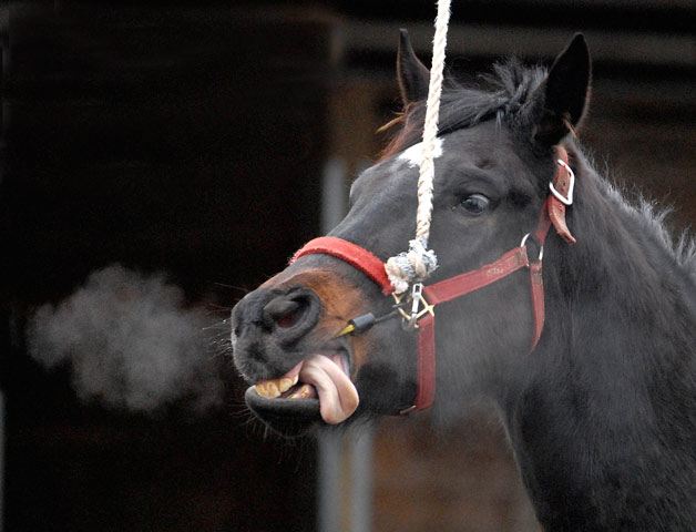 A thoroughbred exercises on a cold morning in the backstretch at Emerald Downs. The winter training season is on at the Auburn oval. The 91-day meet begins April 17.