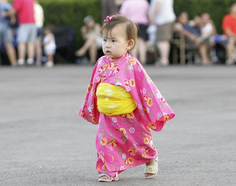 Men, women and children in kimonos moved in graceful circles to the pounding rhythm. A woman tied a pink sash around her daughter’s kimono then ushered her into the parking lot turned dancing grounds. A small boy ran in circles, arms flapping, the excitement too much for his 5-year-old self to contain.