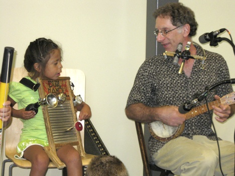 Rick Meyers invited children to play along during the show ‘n tell program, “Old-Time “Old-Time Music Show,” at the Muckleshoot Library on Monday.