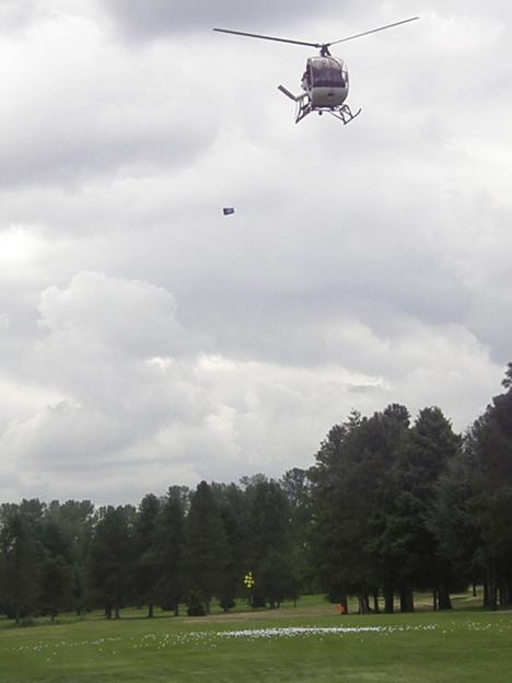 A helicopter, courtesy of Auburn-based Airwork LLC., swooped in over the municipal course’s par-5 10th hole to scatter 1,000 donated and pledged golf balls over a makeshift pin placed in the middle of the fairway.