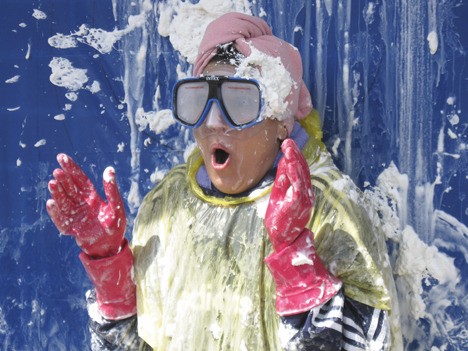 The teachers proved to be good sports, absorbing the blows and even egging on the boys and girls to toss a few between their begoggled eyes.