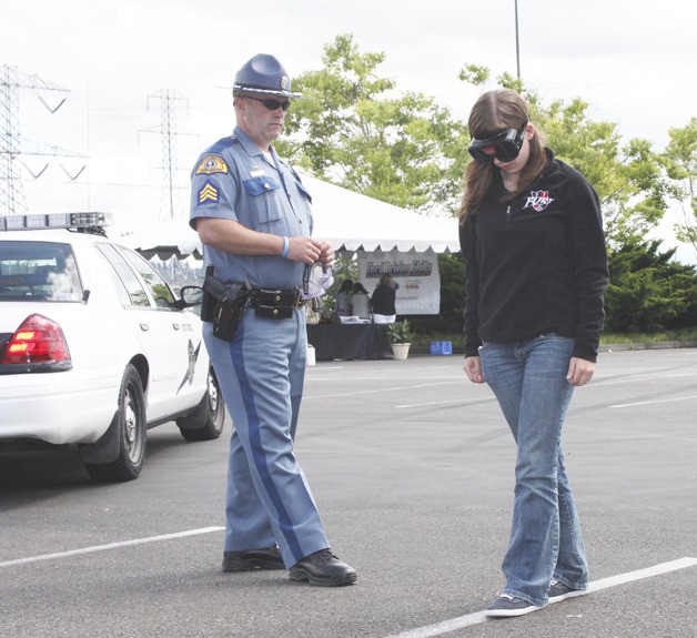 At the impairment station, one of four different stations at the event, Washington State Patrol Sgt. Ken Denton ran the kids through a field sobriety test. Participants were asked to balance on one foot with their other foot held out in front of them, then asked to walk heel to toe down a straight line painted on the ground. They were then asked to perform the same tasks with the goggles on.
