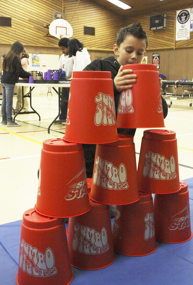 Evergreen Heights Elementary School students joined hundreds of thousands of sport-stackers around the world in an attempt to break last year’s record of 276,053 stackers.