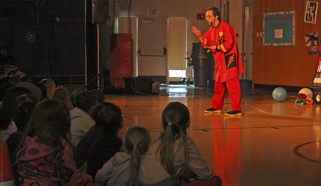 Performer Rhys Thomas wows the crowd at Washington Elementary last Saturday with his educational