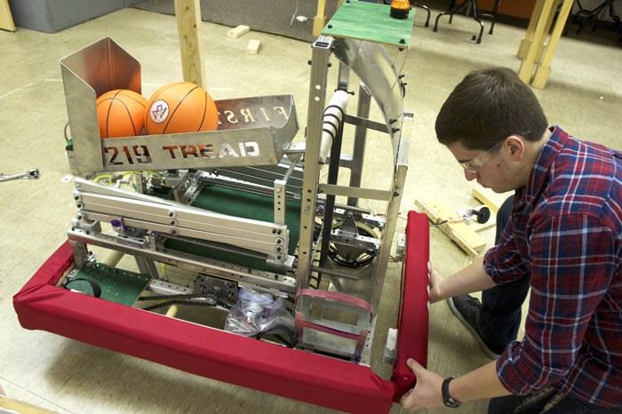 “This year’s game is called ‘Rebound Rumble,'” said Jacob Torgerson, TREAD 3219 Robotics president. “It’s played on a field separated in the middle by a four-inch bump. You can either cross over the bump or there are three bridges. They are like little see-saws and they’re naturally up, so you have to find a way to get them down.”