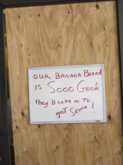 Owner Bruce Alverson, who arrived at his popular eatery 15 minutes later, put up this sign the next day and offered his version of events: “With the energy he got from the banana bread, the burglar made his escape. A fellow can climb to the top of Mount Rainier on that much energy. If I had known he was coming, like Santa, I have would set the banana bread outside the door with a Coke and a note. Our banana bread is very popular.”