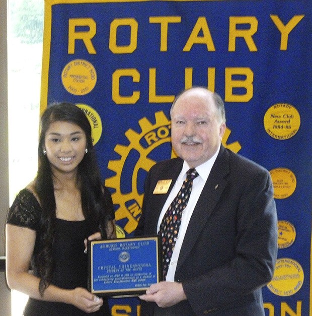 Auburn Mountainview High School’s Crystal Chindavongsa receives the Auburn Rotary Student of the Month award for June from outgoing Auburn Rotary president Michael Hart.