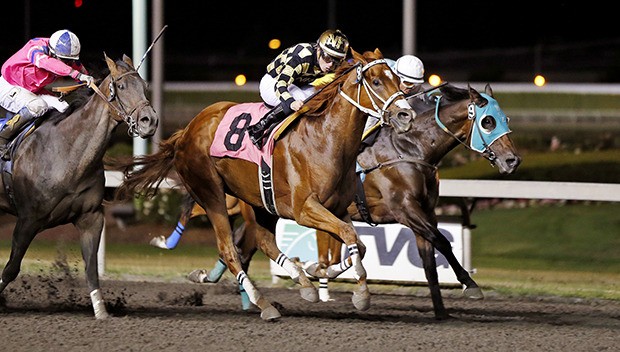 Disruption (No. 8) and jockey Julien Couton power to the lead in the $18