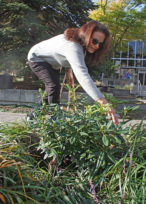 Denise Brown, third from left, joins City leaders and the Domestic Violence Task Force in planting a rhododendron in honor of Brown’s late sister, Nicole. Mark Klaas, Auburn Reporter