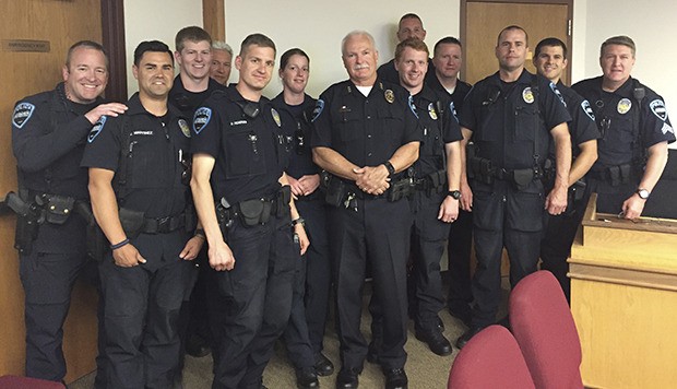 “Over the last five years since being chief, 52 new people have walked through the door, most of those police officers, and most of those are sitting back over here,” Lee said, indicating his guys in blue at the back of the room.