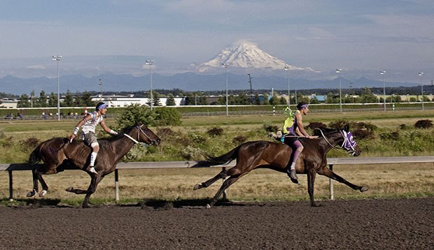 Teams raced twice around the Emerald Downs one-mile track and exchanged horses every half-mile. Each team’s rider had to leap from one galloping horse to another in their assigned exchange box while other team members assisted in handling the horses.