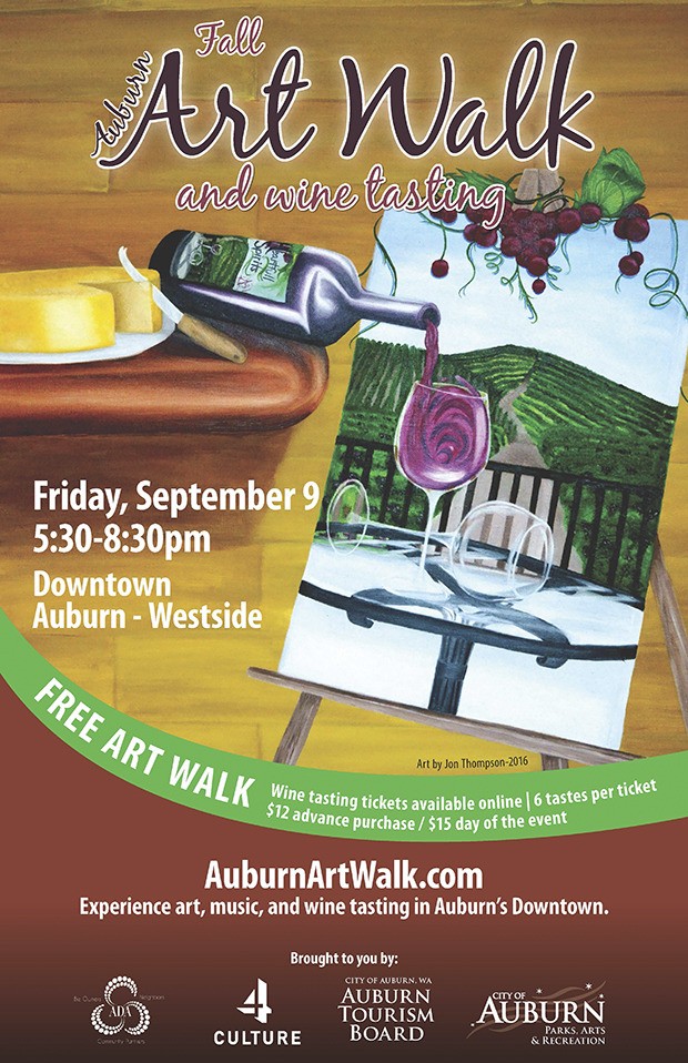 The event is free but wine tasting tickets are $12 pre-sale, $15 at the event and include six 1-ounce tastes and a custom wine glass. Pre-sale tickets are available online at www.auburnartwalk.com or at Green River Cyclery, and Grocery Outlet, 102 Cross St. SE, in downtown Auburn.