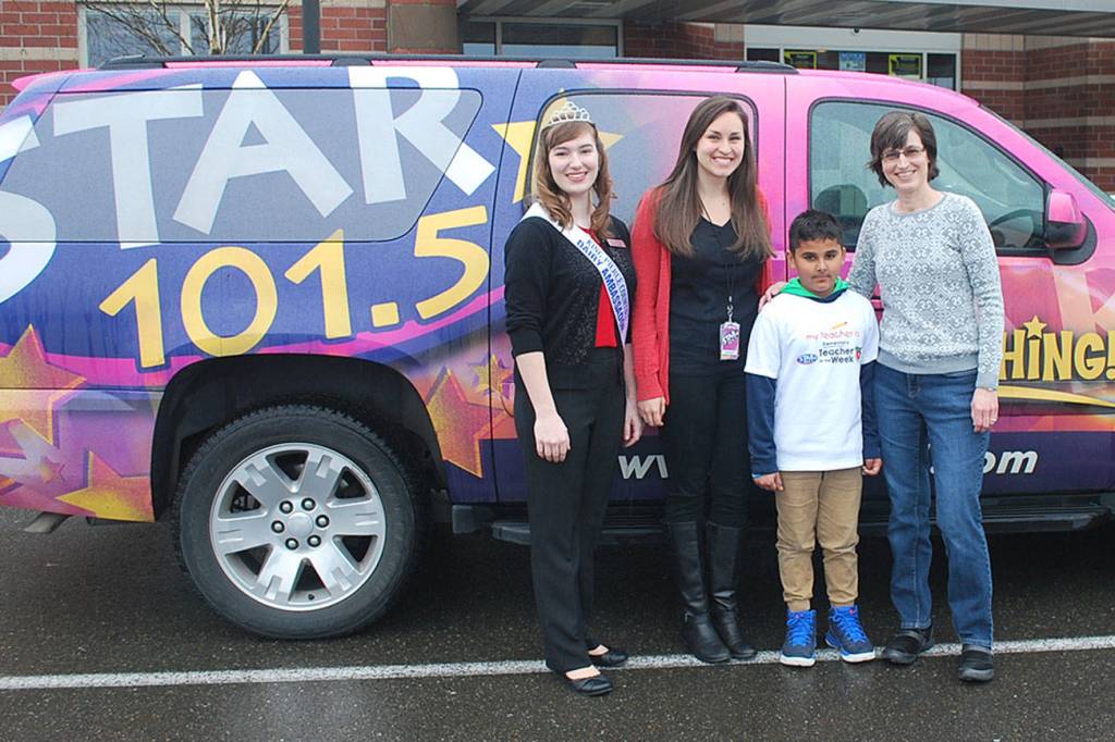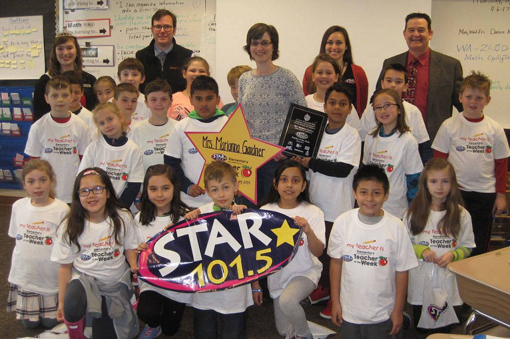 A surprised Marianne Gardner, a third-grade teacher at Arthur Jacobsen, was presented with the STAR 101.5 Elementary Teacher of the Week award on April 6.