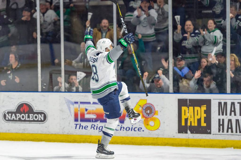 The T-Birds took the three-goal lead back at 12:51 of the second on Kolesar’s second goal of the game. Aaron Hyman poked a loose puck into to the neutral zone where Kolesar got to it. Kolesar turned with the puck into the Everett zone on the right wing. Kolesar took a hard wrist shot from the right circle that beat Hart low on the blocker side.