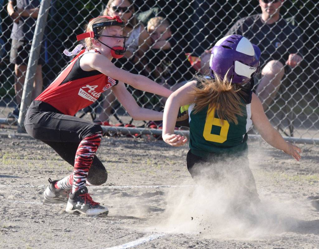 The Rainiers’ Elise Honeysett tags out a baserunner at home. RACHEL CIAMPI, Auburn Reporter