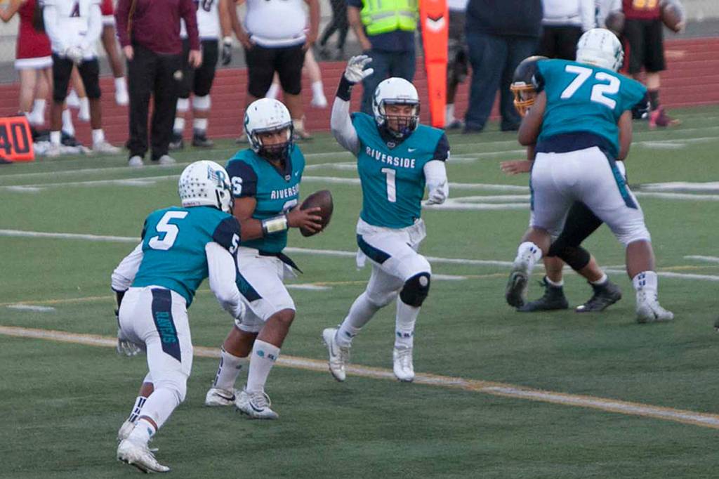 Auburn Riverside quarterback Tiano Malietufa turns to hand off to Javon Forward as Isaiah Prescott makes a play-action move during the Ravens’ 52-0 demolition of Thomas Jefferson on Sept. 14. COURTESY PHOTO, Jamie Malietufa