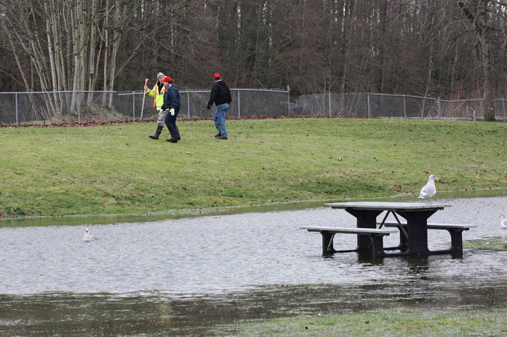 County employees head into the field at designated flood levels to address safety concerns, such as flooded roadways, and to check on flood control facilities.
