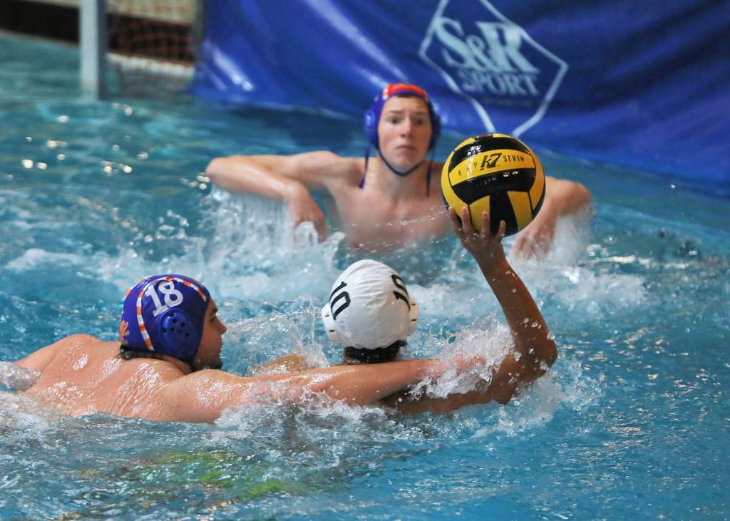 Auburn Mountainview senior Dawson Orcutt (18) defends Kentridge freshmen Zach Celebrado (10) during boys water polo play at the Auburn Pool on Tuesday. Auburn Mountainview prevailed 7-2.