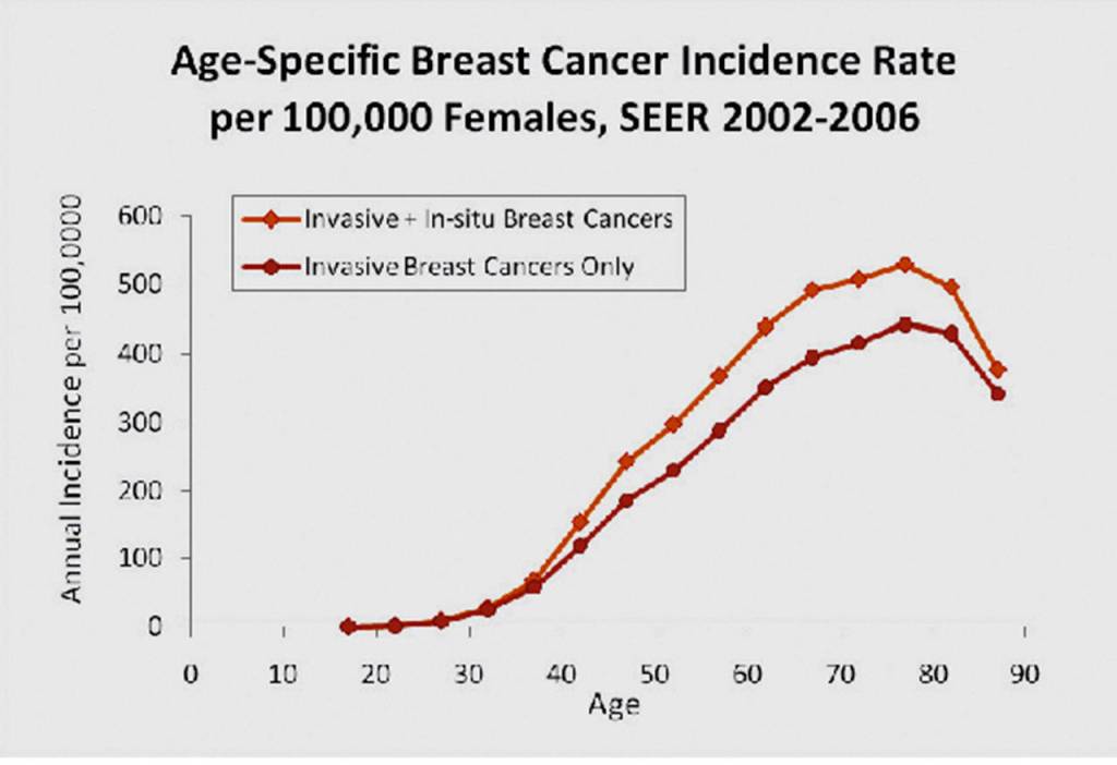 Why do we pick 40 and not 50 to begin mammography? I addressed that in detail in my posting of November 2015. Nothing magical happens at 50. The magic happens at age 40, as depicted in the graph of the NIH/SEER data (public domain data).