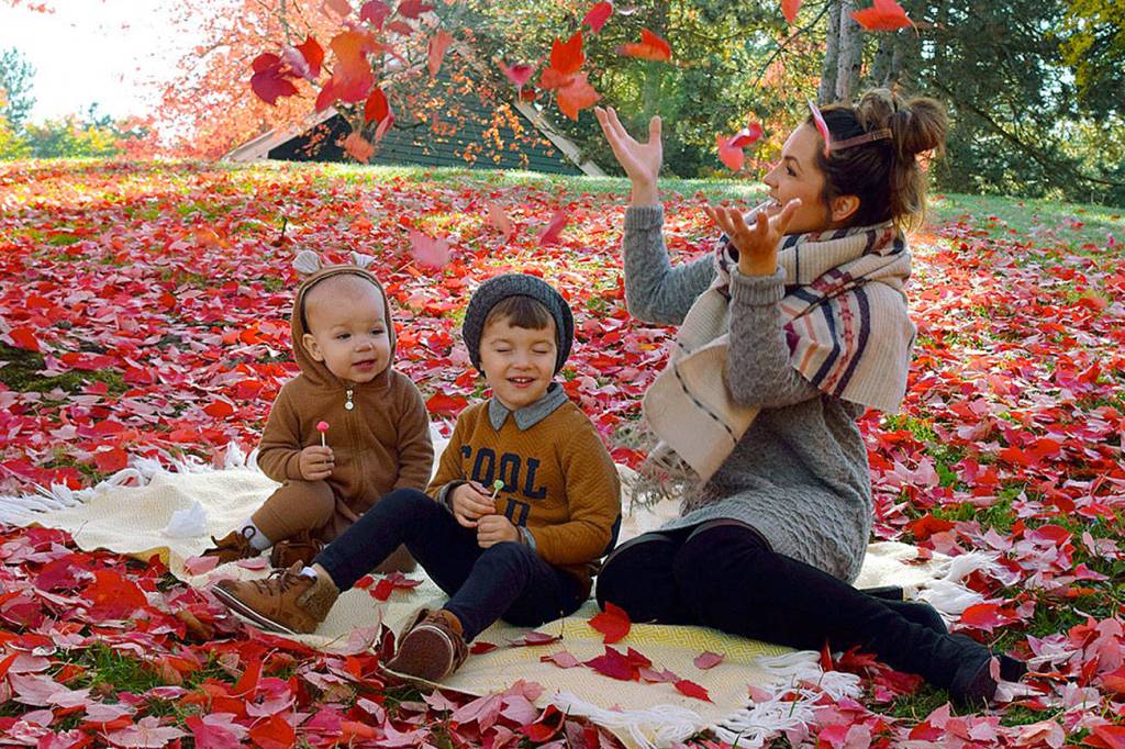 Alina Dzhalodskiy throws leaves at her sons, Jacob, 3, and Lucas, 1, as they enjoy an outing on a sunny Tuesday at Game Farm Park.