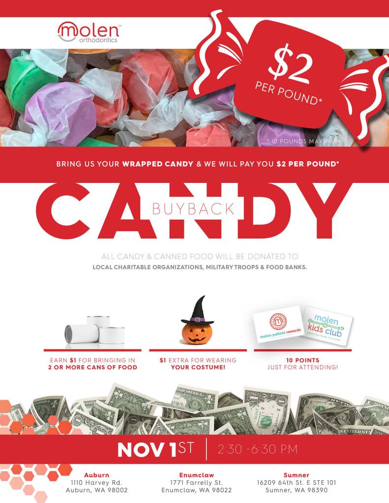 Families and their children can bring wrapped Halloween candy to any of three office locations, and, in exchange, Molen Orthodontic will pay them $2 per pound for the candy (10-pound maximum). It also will pay an extra dollar to the kids who wear their Halloween costumes and an extra dollar to the kids who bring in two or more canned food items.