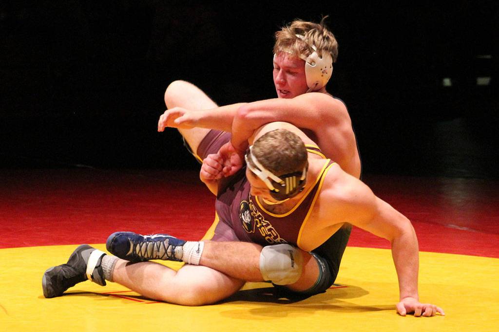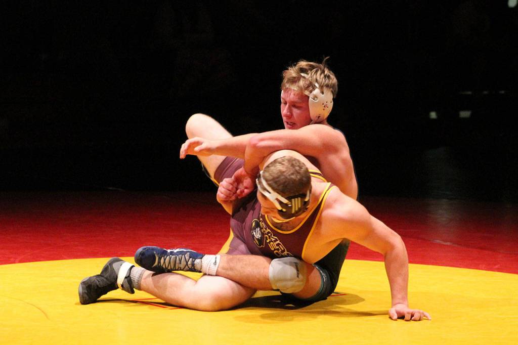 Auburn Riverside’s Sam Onishchenko, top, handles Thomas Jefferson’s Roman Shuck during their 195-pound bout on Wednesday, Dec. 13.