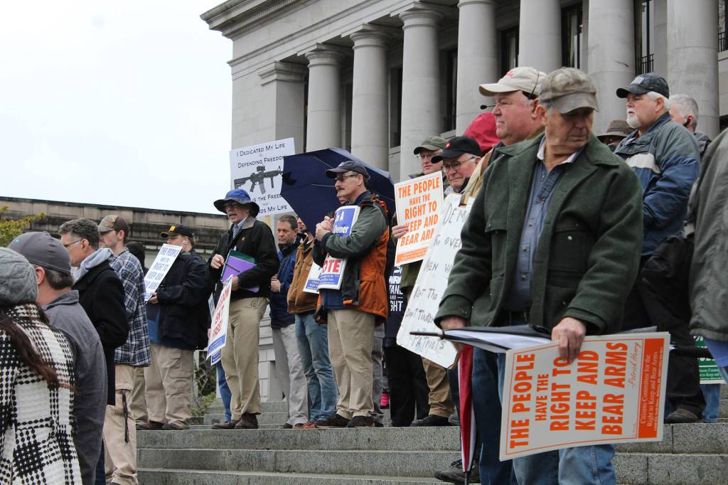 About 100 gun rights supporters rallied on the steps of the Capitol building in Olympia on Friday.
