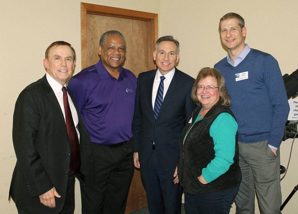 With von Reichbauer, from left, are: Nexus Youth and Families Development Director Michael Jackson; Constantine; Auburn Food Bank Executive Director Debbie Christian; and Auburn Valley YMCA Executive Director Jason Berry.