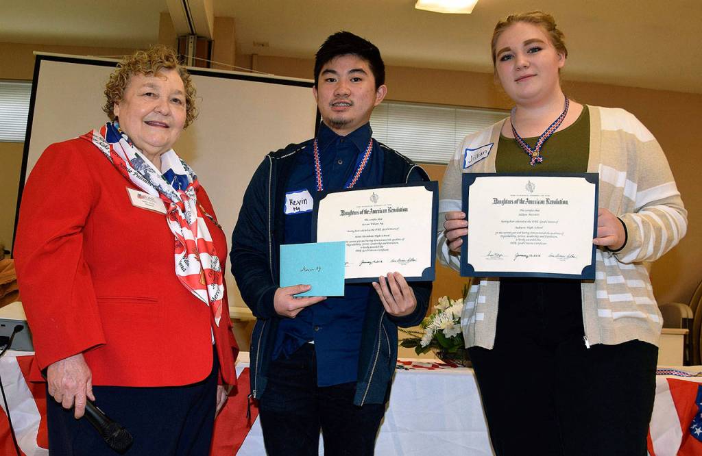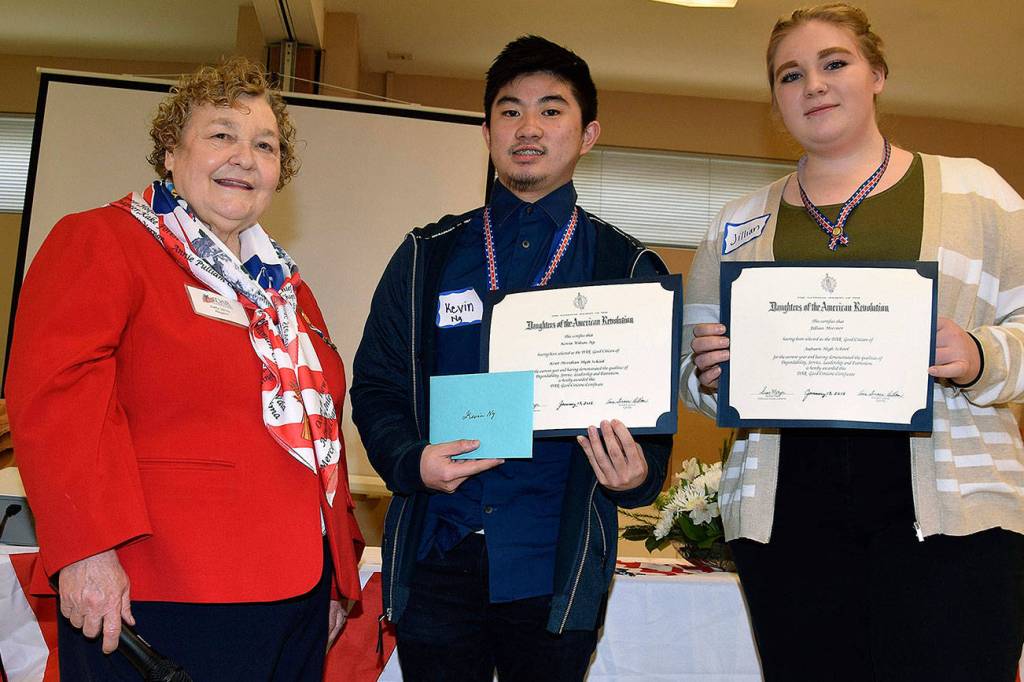 Sally Jarvis of the Daughters of the American Revolution, left, stands with Kevin Ng from Kent-Meridian High School and Jillian Miesner from Auburn High School after the students received the DAR Good Citizens Award.