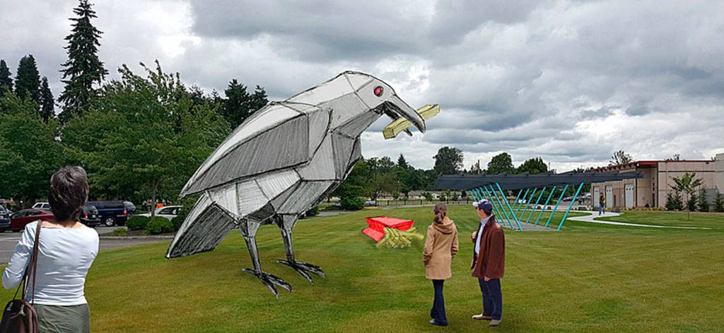 Peter Reiquam, the Northwest artist behind the crow, said the giant, stylized bird should stand about 12 feet high when it takes its place between the sidewalk along Auburn Way South and the architectural remnant of the former drive-in. Facing roughly southeast, perhaps with its head cocked slightly toward the park, “the colossal corvid,” will be made of aluminum, with a durable, semi-gloss, black powder-coated finish.