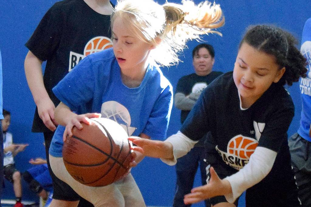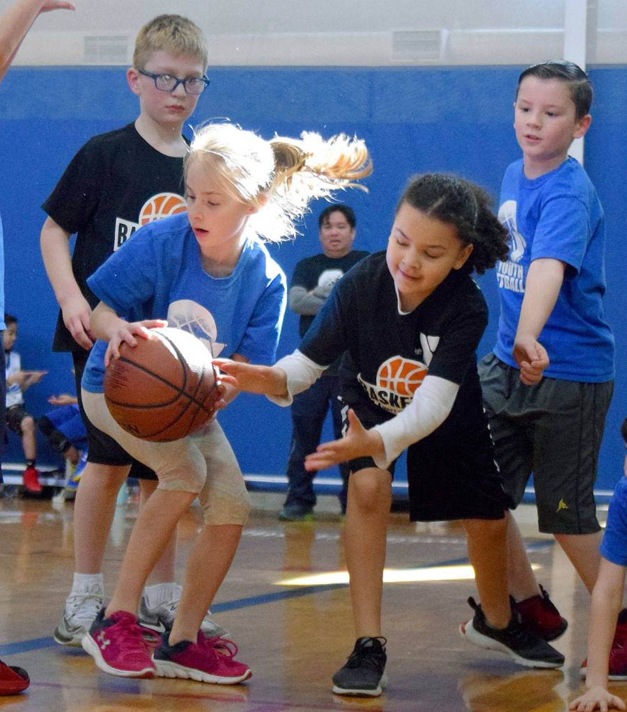 Blue Team’s Taylor Kurth, left, tries to keep the ball from a defender during recent second- and third-grade girls basketball tournament action at the Auburn Valley YMCA. For youth and adult fitness programming and team activities, please visit seattleymca.org. RACHEL CIAMPI, Auburn Reporter
