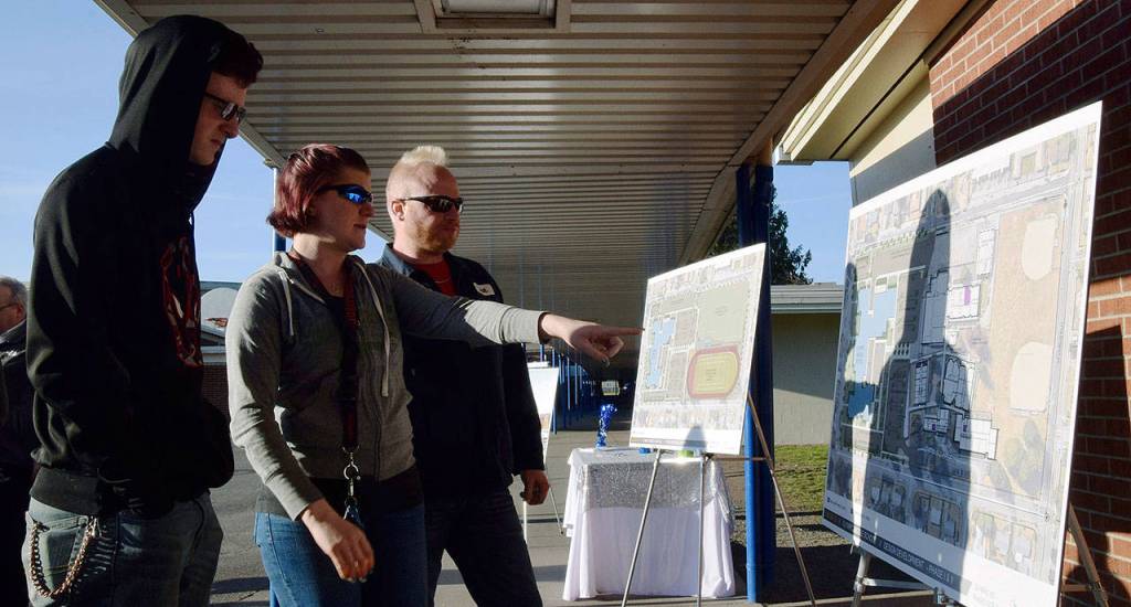 Kaleta and Erik Kingman-Gatz with their son Evan, a seventh-grader at Olympic Middle School, look at what the new school will look at during the recent groundbreaking. RACHEL CIAMPI, Auburn Reporter