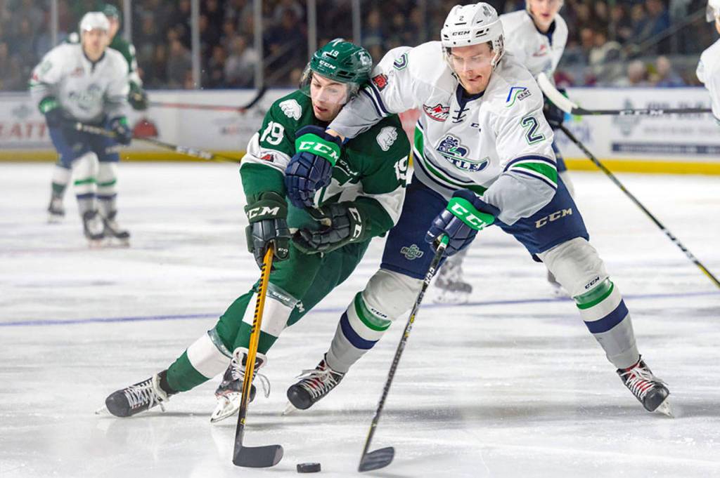 Second period – 3, Everett, Fonteyne 1 (Christiansen, Wylie), 4:58 (pp). Penalties – Dewar, Evt (roughing), 2:51. Ottenbreit, Sea (roughing), 2:51. Strand, Sea (tripping), 3:08. Ottenbreit, Sea (checking to the head), 10:02. Sharp, Evt (roughing), 16:41.