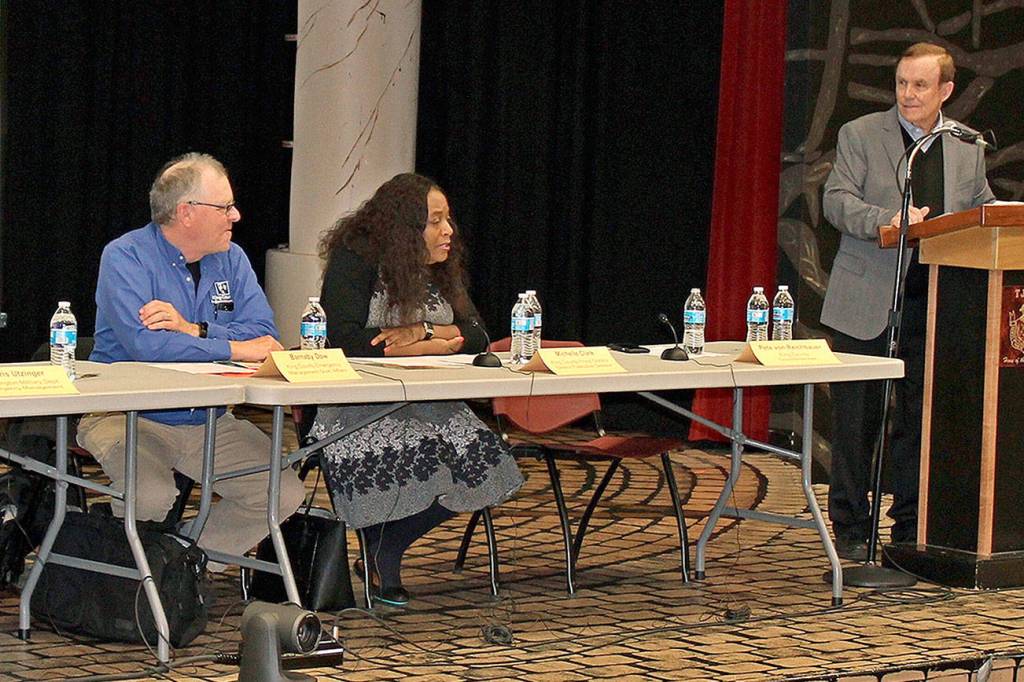 Nearly 100 people joined King County Councilmember Pete von Reichbauer at a town hall meeting on flood and emergency preparedness at Thomas Jefferson High School on April 18.