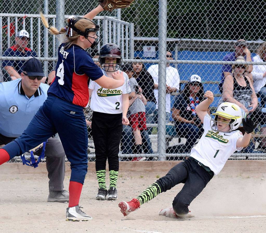 Auburn’s Izzy McDonough steals home, sliding safely in front of the Federal Way catcher as her teammate, Maddie McCarthy (2), watches during 9-10 All-Star District 10 fastpitch tournament play last Saturday. Auburn lost 15-14 in extra innings.