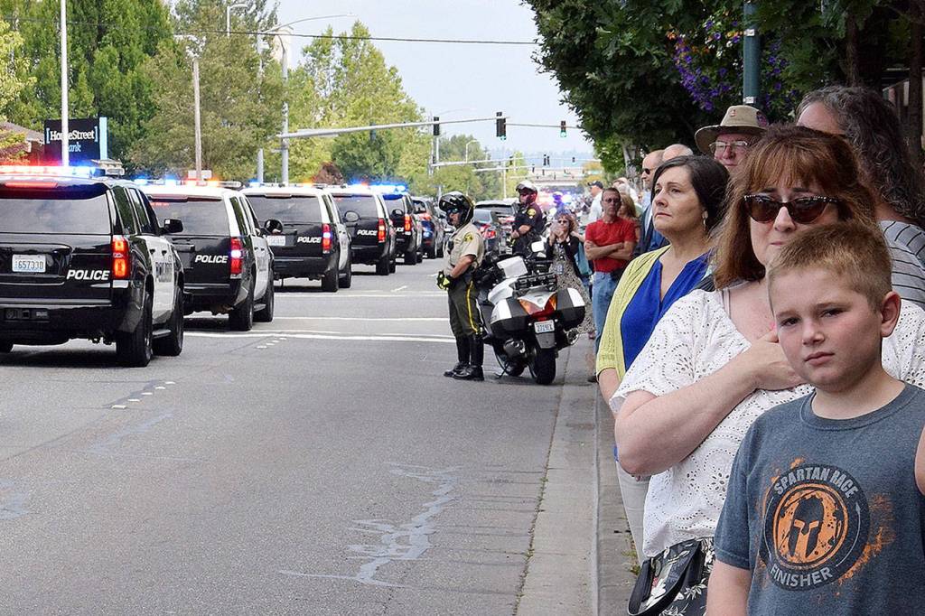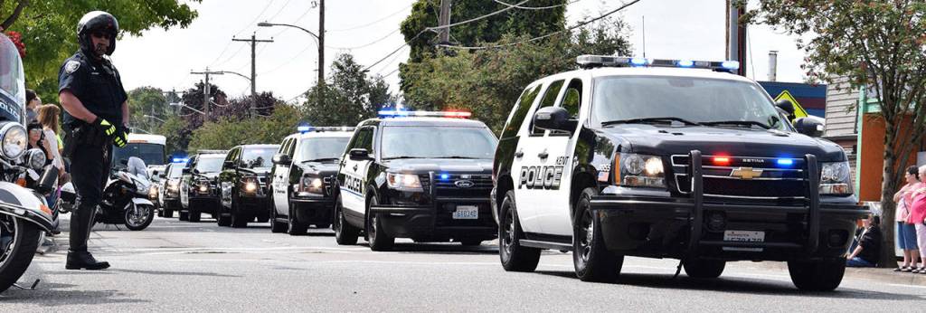 A procession from Emerald Downs in Auburn to the ShoWare Center drew folks along Fourth Avenue in Kent to watch as motorcycle officers, a bagpipe band and police and vehicles headed down the street. Outside the ShoWare, officers stood at attention as the Moreno family arrived along West James Street and walked into the arena to celebrate the life of Diego Moreno.