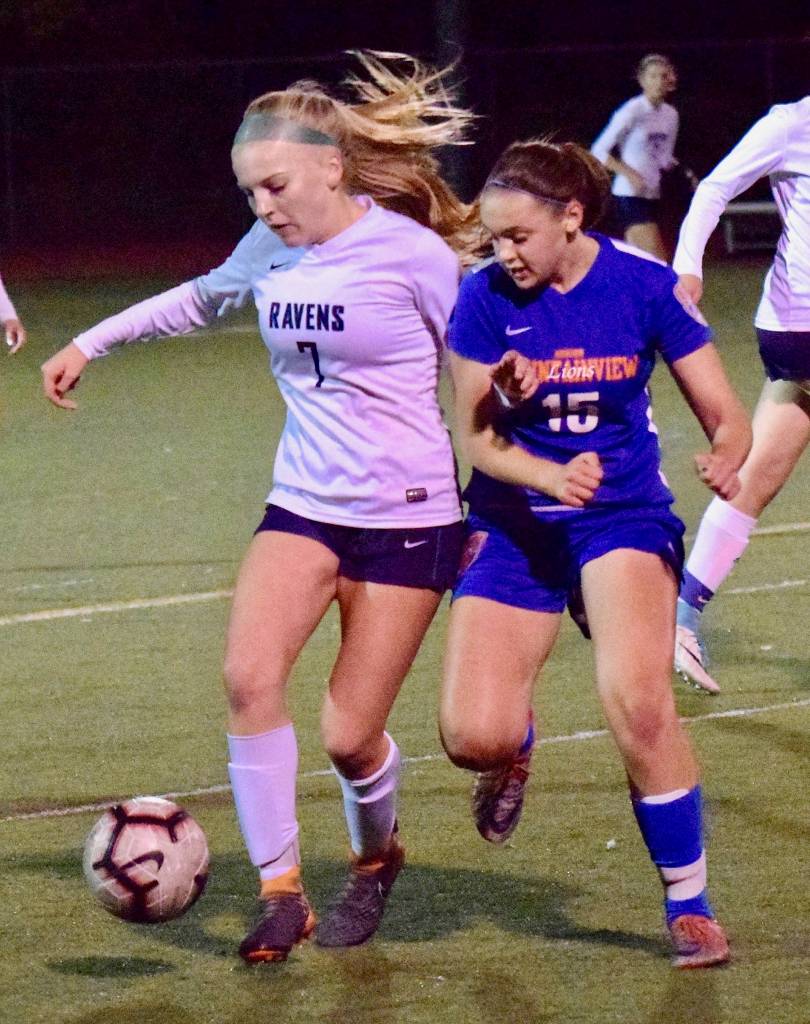 Auburn Riverside’s Kayla Rydberg, left, and Auburn Mountainview’s Elin Hires battle for the ball during NPSL girls soccer action Wednesday night. RACHEL CIAMPI, Auburn Riverside