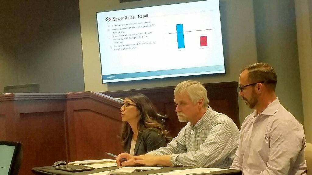 From left, Angie Sanchez of the FCS Group, a consulting firm, explains proposed utility rate increases to the Auburn City Council on Monday at City Hall. She is flanked on her left by Bob Brooks, the city’s financial planning manager, and Kevin Fuhrer, the city’s systems finance director. ROBERT WHALE, Auburn Reporter