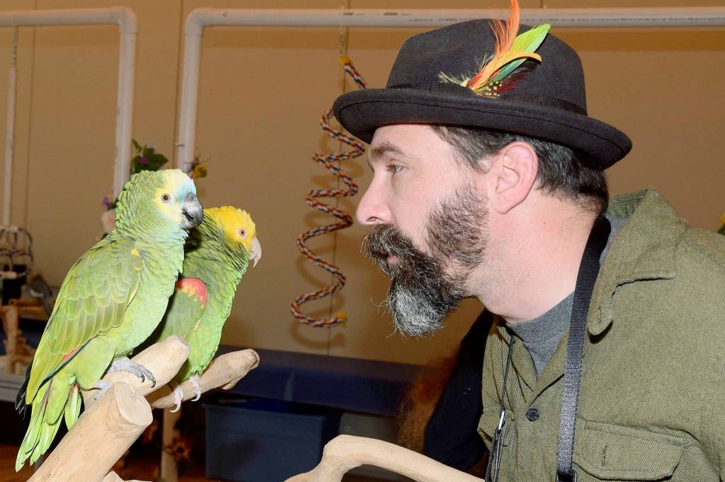 Jeff Smith, above, gets up close to talk to a pair of parrots in Parrot Hall during the Seattle Parrot Expo, The Rainforest Returns, at the Auburn Community and Event Center last Saturday.
