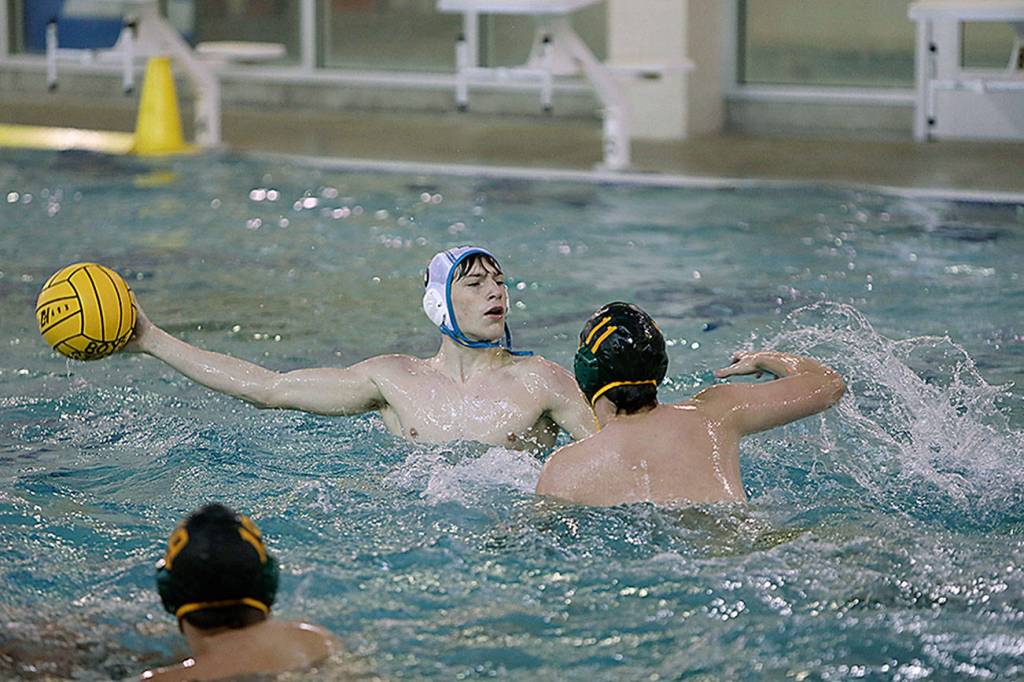 Auburn Riverside sophomore Justin Pritchard looks to pass the ball as Kentridge senior Adrian Tirtu defends during Puget Sound Water Polo League Division 2 playoff action last Friday at the Rogers High School pool.