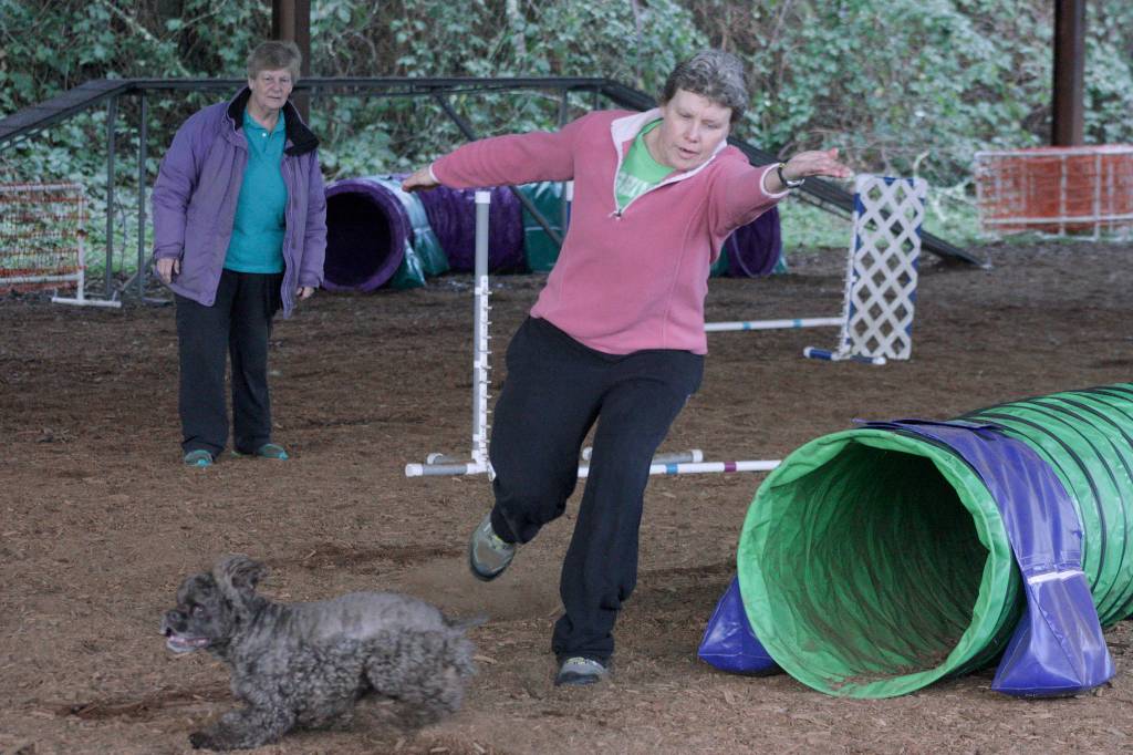 With Sandra Katzen observing, Cathy Percy instructs Ketch, her cocker spaniel, to clear the next obstacle during training at the Vortex Agility and Dog Training arena on Kent’s East Hill. MARK KLAAS, Auburn Reporter