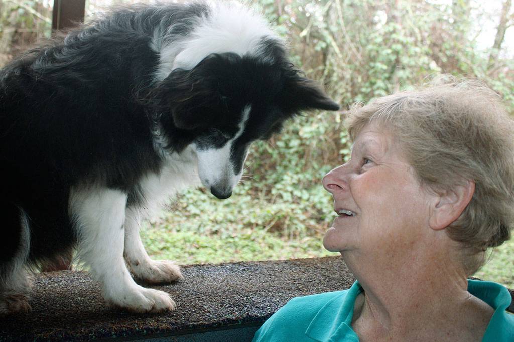 Sandra Katzen talks to Pixi, 12, one of her border collies who occasional competes during a pause in morning training at the Vortex Agility and Dog Training center on Kent’s East Hill. Katzen, who has trained, competed and served as a judge in the sport of agility dogs for 30 years, recently was inducted into the United States Dog Agility Association (USDAA) Hall of Fame. MARK KLAAS, Auburn Reporter