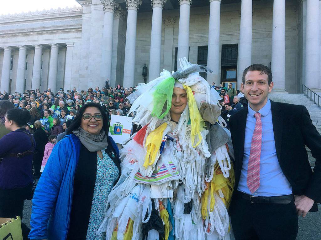 Sen. Mona Das and Rep. Joe Fitzgibbon with the “Bag Monster” on the steps of the Capitol Building in Olympia. COURTESY PHOTO