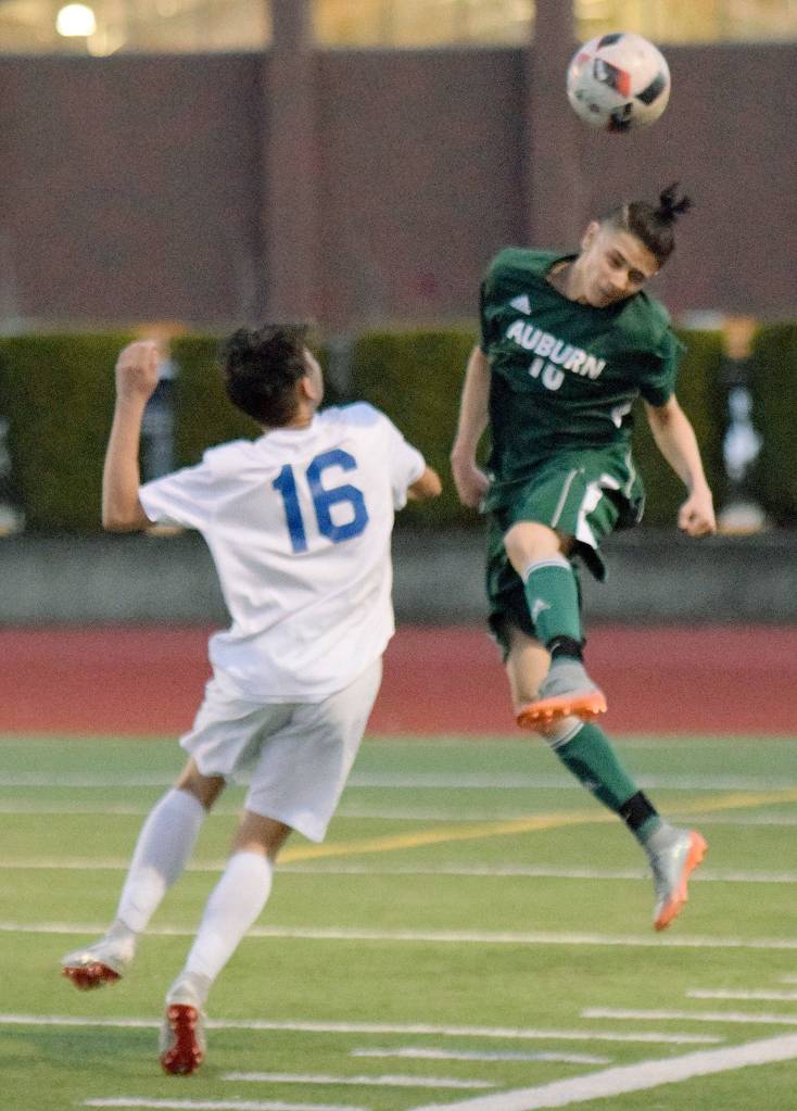 Auburn’s Mohammed Sultani, right, heads the ball as Auburn Mountainview’s Leonardo Montiel defends during North Puget Sound League Olympic Division soccer action Tuesday night.