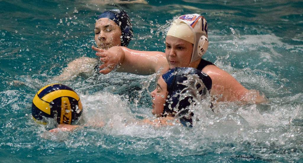 Auburn Mountainview’s Kenzie Hilderbrand tries to grab the ball from Auburn Riverside’s Salina Decker and Mckenzie Smith during girls water polo play Monday at the Auburn Pool.