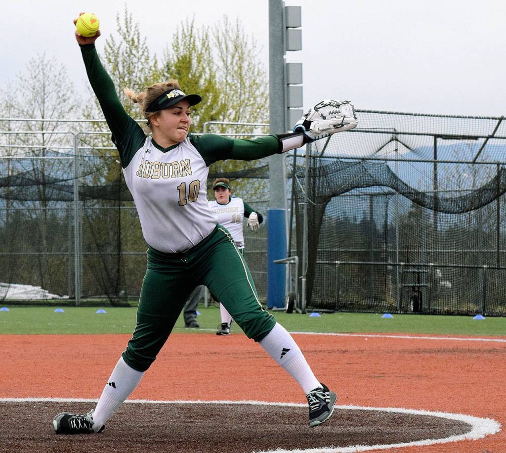 Kiana Adams ripped a three-run, inside-the-park home run and tossed a complete-game seven-hitter, striking out 11, as Auburn stayed unbeaten with an 8-3 North Puget Sound League Olympic Division softball victory over Auburn Mountainview on Tuesday.