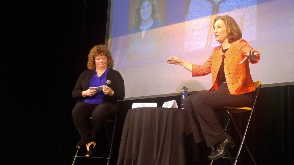 U.S. Rep. Kim Schrier, right, answers questions submitted to her by constituents and collected by Auburn Mayor Nancy Backus, left, during her town hall appearance at Green River College on April 17. ROBERT WHALE, Auburn Reporter