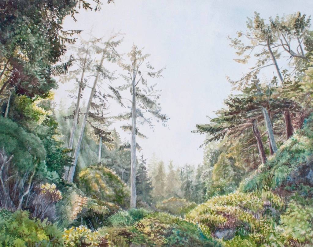Each of the paintings featured show how water filters through landscapes. Lassaline painted these detailed images in her studio using reference photos she takes while walking, hiking, and canoeing. Locations include the salmon-filled stream at the farm, the wild inlets of Isle Royale National Park in Lake Superior, a serene river in mid-coast Maine, Kalaloch Beach on the Olympic Peninsula, the churning dam at the Ballard Locks and the Elwha River below the dam removal site and at its sandy delta, among others.