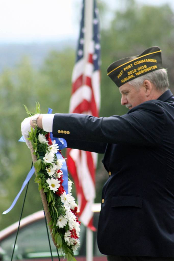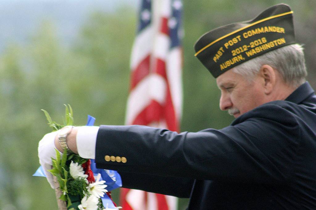 Frank Bannister, former VFW Post 1741 commander, lays a memorial wreath during last year’s Memorial Day observance at Mountain View Cemetery. MARK KLAAS, Auburn Reporter